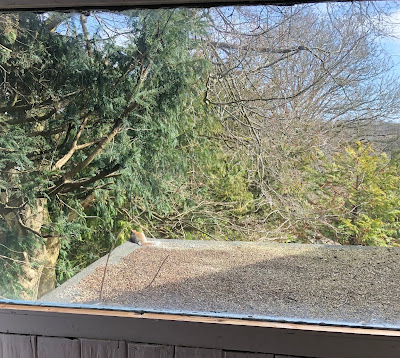 Below, daffs looking cheery, a quick walk from Shadric's studio, a squirrel spotted through one of his studio windows, showing the trees that the wind soughed in all day. Lovely.