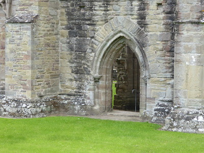 Off then into the Wye Valley, and to look at Tintern Abbey, which windy old Wordsworth liked so much, he wrote one of his better poems about. A gorgeous road through forested hills, and Tintern Abbey impressive, although you couldn't actually wander about it as it was closed. Peering in, seeing the forest through empty windows, and arched doorways looking at remains of other arched doorways inside, all rather lovely. We mooched about and then crossed the river and had a wooded walk alongside the river with glimpses of the Abbey through the trees.